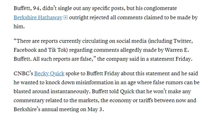 美国消费者新闻与商业频道(CNBC)4日就这一声明向巴菲特求证,巴菲特说他想在一个虚假谣言可以立即传播的时代打击虚假信息。巴菲特告诉CNBC,从现在到5月3日伯克希尔·哈撒韦公司的年会期间,他不会对市场、经济或关税做出任何评论。