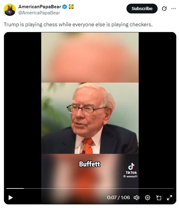 特朗普转发该视频后,巴菲特旗下伯克希尔·哈撒韦公司迅速否认了这一说法。该公司在一份声明中表示:“目前社交媒体(包括X、脸书和TikTok)上流传着有关沃伦·巴菲特发表言论的报道,所有这些报道都是虚假的。”